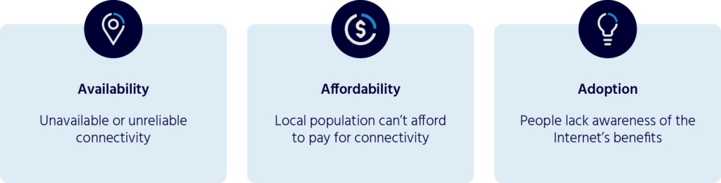 Más de 2000 millones de personas, aproximadamente una cuarta parte de la población mundial, permanecen desconectadas y la mayoría vive en comunidades remotas, rurales, de bajos ingresos y aisladas. En general, no pueden conectarse a Internet por tres razones principales: